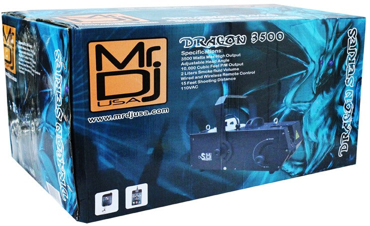 This MR DJ DRAGON3500 fog machine is perfect for any party, mobile entertainers, small nightclubs, bars, events, or light show. The DRAGON3000 has a high-efficiency heater that quickly burns through the fog liquid. It has a 2-liter internal fog fluid tank, a fog fluid level indicator, and a wired remote control, and it only uses water-based fog fluid.