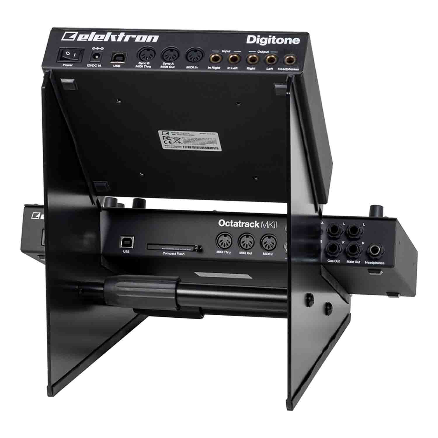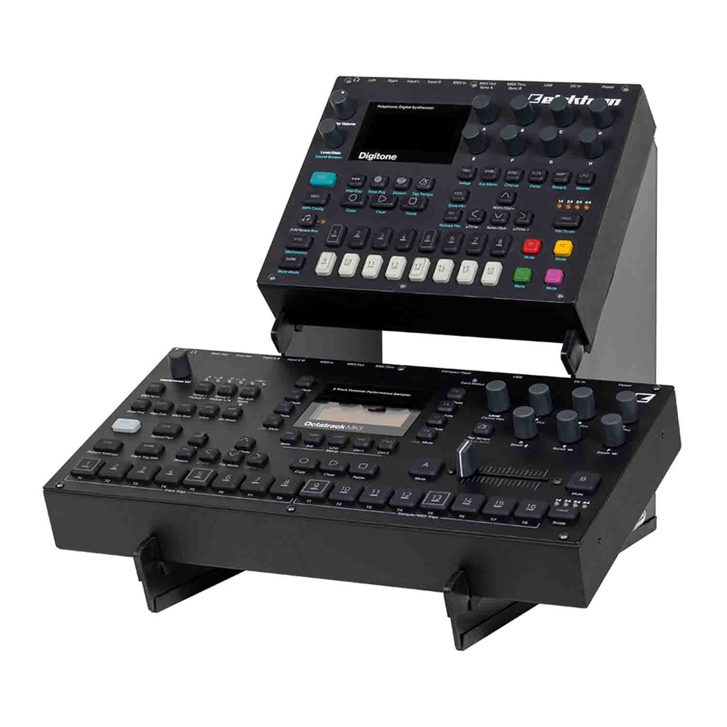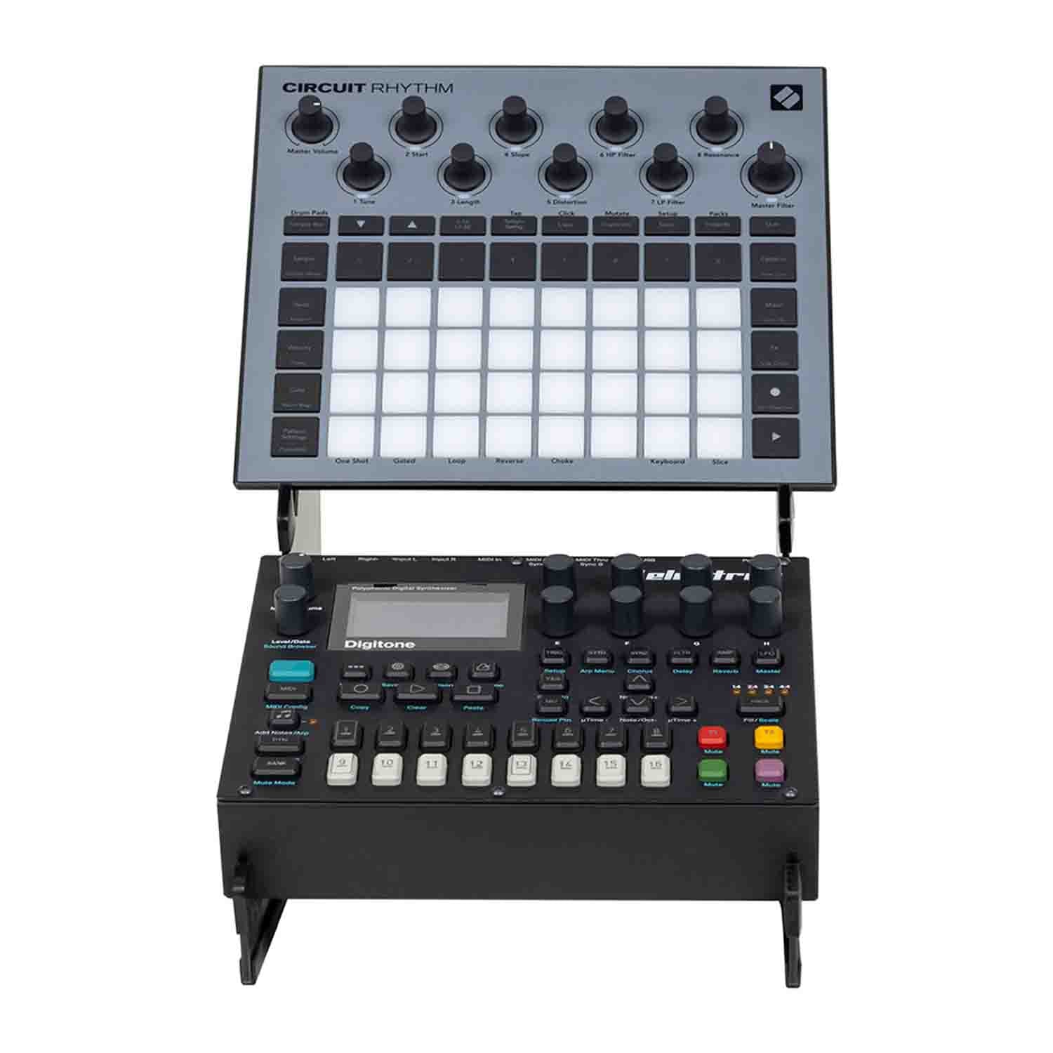 The Headliner HL22052 is a 2-Tier Desktop Synth Stand. The Headliner 2-Tier Desktop Synth DJ Stand was designed to improve your workflow and help you stay organized while fitting more gear on your production desk. It fits two compact devices like synthesizers, controllers, drum machines, and effects modules. The angled design makes it easier to reach knobs and view LCD screens. The Headliner 2-Tier Desktop Synth Stand is adjustable in width from 7.3” to 11.5” and fits a variety of devices from Roland, Korg, Elektron, and more (partial list below). It is made from solid steel and includes non-slip rubber strips for added stability.
