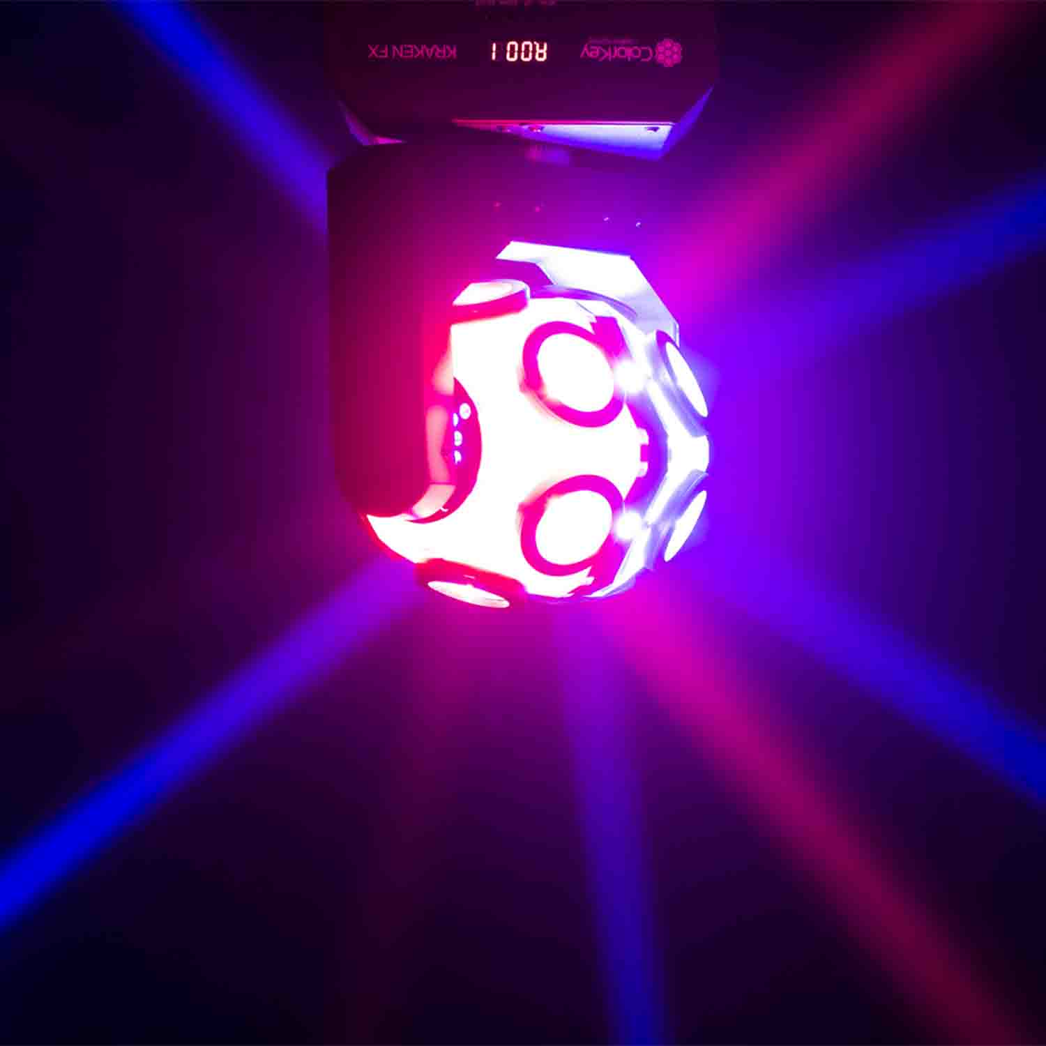 The Colorkey CKU-1070 is a Kraken FX Energizing Quad Color LED Effect Light with Built-in Blinder Perfect for Mobile DJs, Bars, and Clubs, the ColorKey Kraken FX creates energy with its frenzied movement and tentacle-like beams of light. Featuring (7) 10W Red, Green, Blue, and White LED’s positioned alongside a strobing LED strip, Kraken offers dizzying pan rotation and infinite tilt rotations allowing it to create a one-of-a-kind FX lighting experience. The 100% dimmable strobe also acts as a blinder when needed. Controlled with 512DMX, Sound Active or Auto Programs, Kraken works well as a centerpiece light. Like a mythical creature rising from the depths, Kraken bursts into action with a dazzling display of light and movement